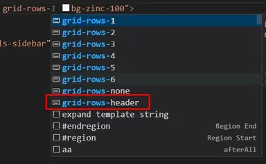 If you installed the TailwindCSS extension in VSCode, you should see grid-cols-sidebar and grid-rows-header classes on IntelliSense: